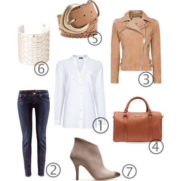 1) Fehér blúz (Mango) – 4 995 Ft 2) Super Skinny farmer (H&M) – 5 990 Ft 3) Drapp velúr dzseki (Mango) – 19 995 Ft 4) Barna táska (Bershka) – 8 995 Ft 5) Barna-arany öv (Parfois) – 3 995 Ft 6) Karkötő (Stradivarius) – 2 595 Ft 7) Bokacsizma (Zara) – 9 995 Ft