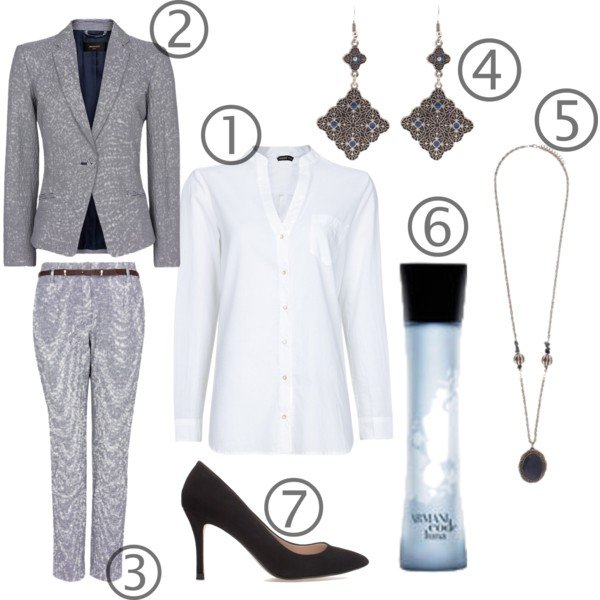 1) Fehér blúz (Mango) – 4 995 Ft 2) Csíkos blézer (Mango) – 15 995 Ft 3) Csíkos nadrág (Mango) – 11 995 Ft 4) Mozaikos fülbevaló (Parfois) – 1 695 Ft 5) Kék medálos nyaklánc (Parfois) – 3 495 Ft 6) Armani Code Femme Luna parfüm (Douglas) – 13 775 Ft 7) Fekete magassarkú cipő (Zara) – 15 995 Ft
