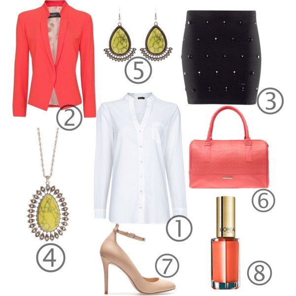 1) Fehér blúz (Mango) – 4 995 Ft 2) Narancs asszimetrikus blézer (Mango) – 9 995 Ft 3) Fekete köves ceruza szoknya (H&M) – 3 990 Ft 4) Sárga medálos antik hatású nyaklánc (Parfois) – 3 495 Ft 5) Sárga köves fülbevaló (Parfois) – 2 295 Ft 6) Korall színű táska (Bershka) – 8 995 Ft 7) Nude bokapántos magassarkú (Zara) – 15 995 Ft 8) Color Riche Le Vernis körömlakk (L’Oreal) – 998 Ft