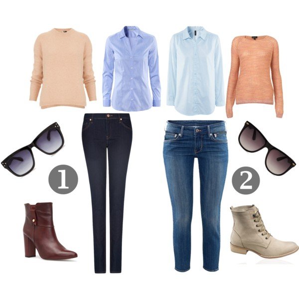 1) Kerek nyakú kötött pulóver (Topshop) – £55; Kék karcsúsított ing (H&M) – 3 990 Ft; Sötét slim farmer (Mango) – 6 995 Ft; Napszemüveg (Mango) – 6 595 Ft; Barna bokacsizma (Mango) – 14 995 Ft 2) Rózsaszín kötött pulóver (Topshop) – £38; Kék, galléros ing (H&M) – 2 990 Ft; Kék skinny farmer (H&M) – 8 990 Ft; Napszemüveg (Mango) – 4 995 Ft; Világos bakancs (Deichmann) – 7 990 Ft